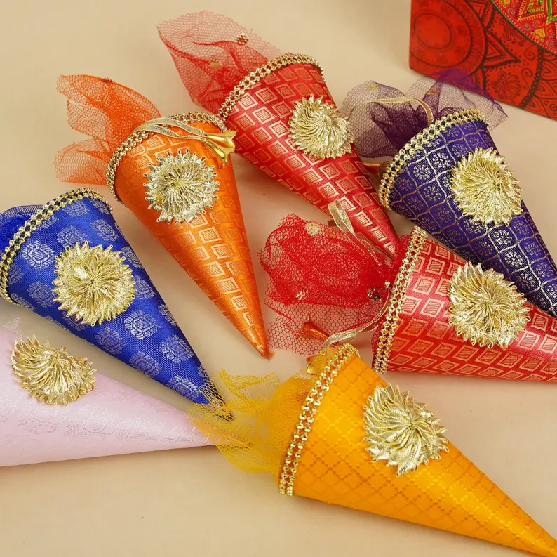 Add a stylish twist to your gift presentation with our Cone-Shaped Bid Pouches. These eye-catching 5-inch pouches are perfect for holding small treats or jewelry during Nikkah, Mehendi, weddings, and other festive occasions.