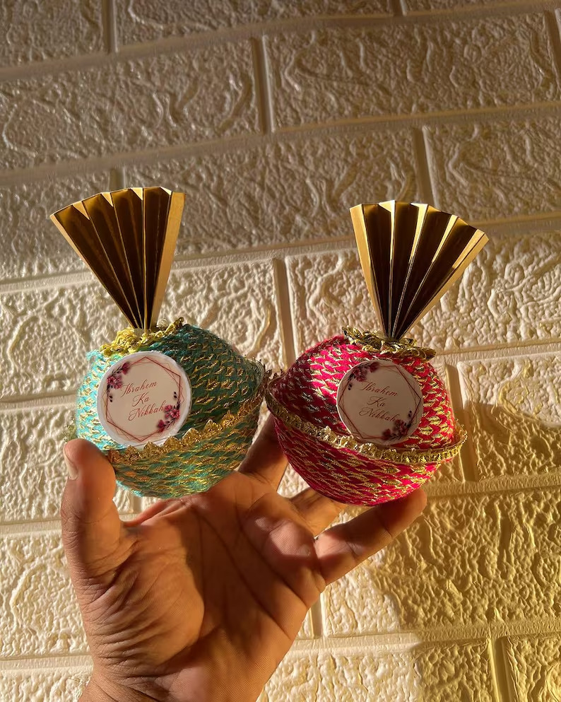 Sized at 4 × 4 inches with a 4-inch depth, they are compact yet roomy enough to hold wedding essentials and festive giveaways like candies, chuwaray, bangles, earrings, or mini chocolates.
