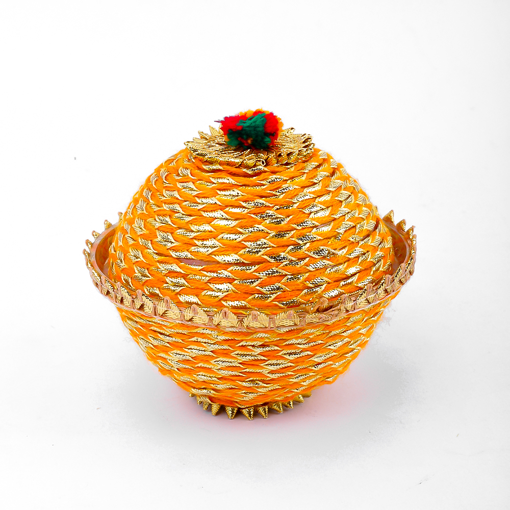 Make your wedding or festive event extra special with our Organza Matki Pouches with Gota Work – a perfect fusion of tradition and style. These beautiful pouches are designed in a classic matki shape with a sturdy plastic box base, wrapped in soft organza fabric and finished with traditional gota detailing.